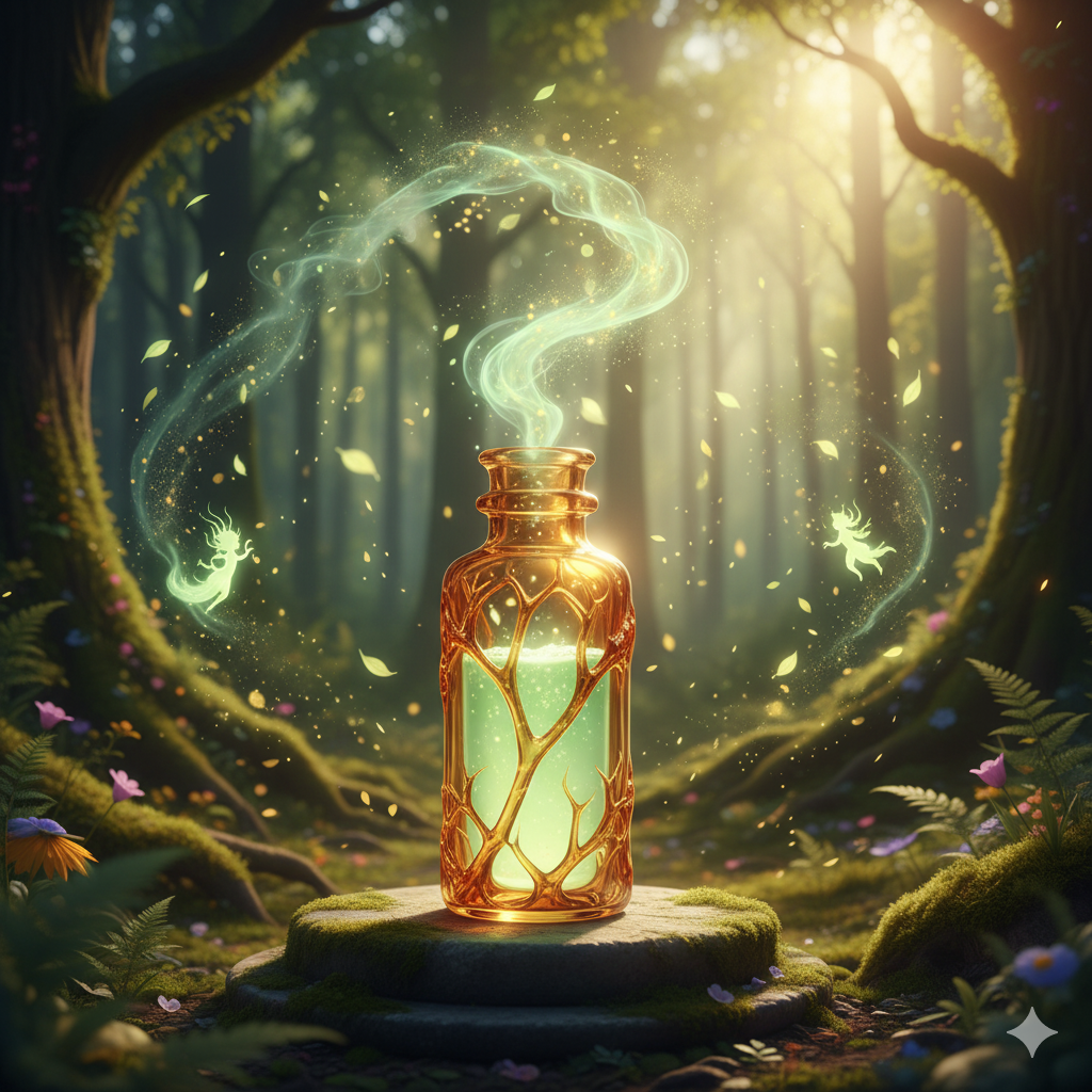 Ez a halványzöld, enyhén foszforeszkáló folyadék egy vékony, borostyánba zárt üvegcsében található. Felbontáskor a levegő megtelik erdei illatokkal, és a természet mintha egy pillanatra megnyitná kapuit.